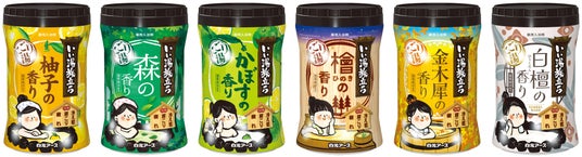 今回、ボトルタイプの『いい湯旅立ちボトル にごり湯』をリニューアルいたします。温泉成分(硫酸ナトリウム)が温浴効果を高めて血行を促進し、疲労回復や肩のこり等に効果があります。また、保湿成分はチンピエキスとトウキエキスをダブル配合しました。パッケージデザインは、香り名、効能を正面に大きく配置し、消費者が店頭で香りや効能を比べながらお気に入りの商品を選びやすくしました。そして、香りのラインナップは「柚子、森、かぼす、檜、金木犀」に、幅広い世代に人気の『白檀の香り』が加わり6種類となります。