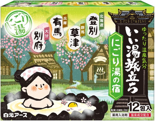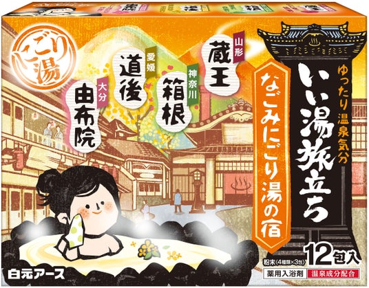 今回、粉末分包タイプの『いい湯旅立ち』をリニューアルいたします。温泉成分(炭酸水素ナトリウム、硫酸ナトリウム)が温浴効果を高めて血行を促進し、疲労回復や肩のこり等に効果があります。また、保湿成分はチンピエキスとトウキエキスをダブル配合しました。パッケージは各商品のテーマに沿った旅先の情景が感じられるデザインとなっています。さらに、日頃のご愛顧に感謝し、数量限定でプラス2包(14包入)の増量企画品を発売いたします。
