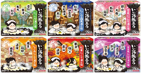 有名温泉地をイメージした薬用入浴剤「いい湯旅立ち」は、風情漂う香りとしっとりした湯上がり感で、ご自宅等で気軽に温泉気分を楽しめるシリーズです。幅広い世代の方々にご使用いただける、ほっこりしたやさしいパッケージデザインも好評をいただいています。