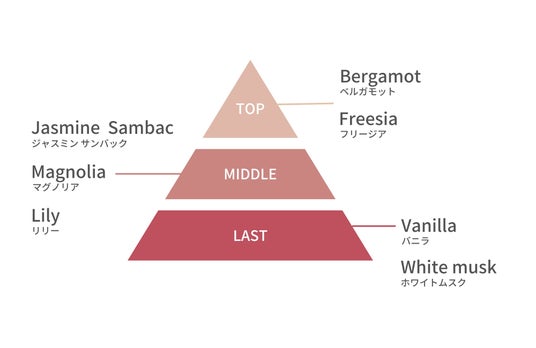 フレグランスについてジャスミンサンバックや、リリーなど香り豊かな花々と、温かみのあるバニラ、ホワイトムスクの心地よい香り