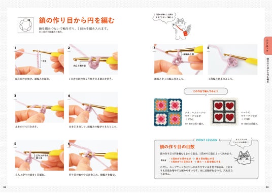 また、編んだアイテムを実用的な作品に活用するためのアレンジ方法や、長く愛用するためのケア方法も紹介。巻末には、学んだことを実践できるモチーフつなぎ、あみぐるみ、バッグなどのレシピつき。