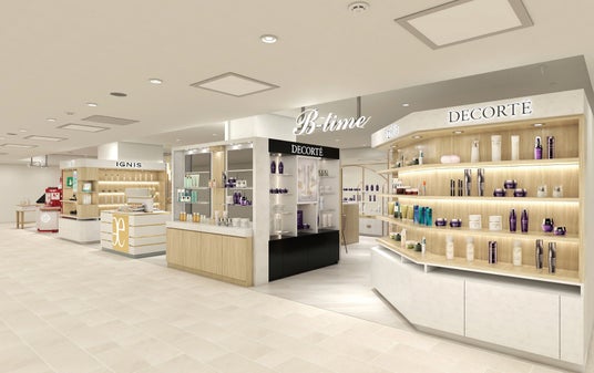 前身のヤンレイ市川化粧品店と比べ約2倍の広さとなるB-time市川店では、ブランド毎のゾーニングがわかりやすくなり、新たに設けられた店頭プロモーションスペースでは新商品紹介など美容情報の発信を行います。さらにアドバイステーブルの拡充、エステ体験スペース・ミスト体験スペースの新設など、これまで以上にお買い物+αの体験価値をご提供する店舗となります。
