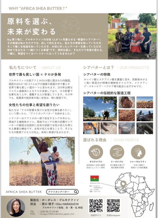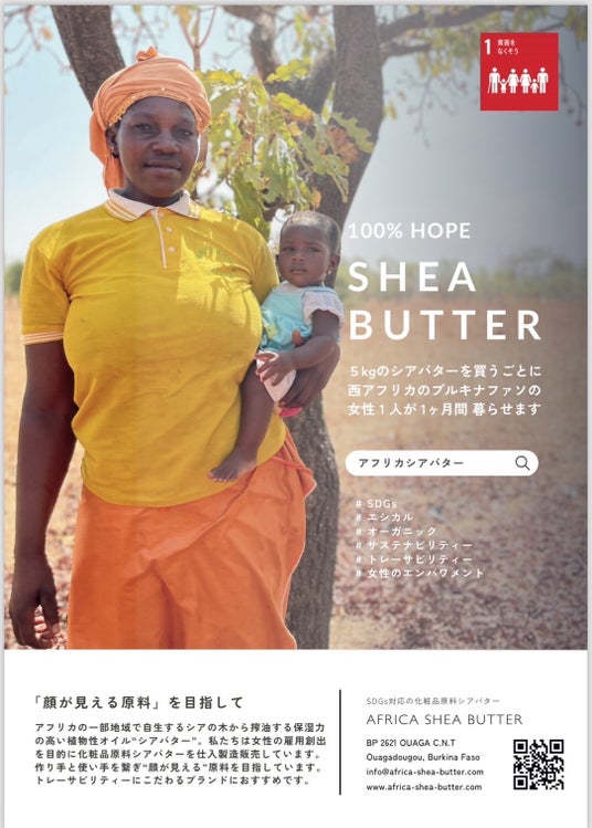 トリートメントに使用しているシアバターを、最貧国のひとつであるアフリカのブルキナファソで、テロの影響を受けた女性や子どもたちの支援になるシアバターに調達先を変更しました。このシアバターを使うことで、貧困に苦しむ女性に所得向上のチャンスを作り、その子どもたちが学校や病院に行けることにつながります。
