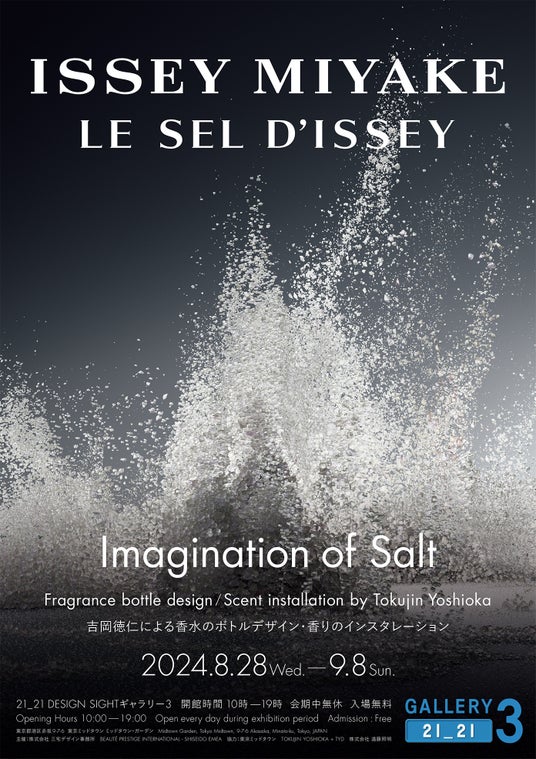 その発表を機に、8月28日(水)より9月8日(日)まで、21_21 DESIGN SIGHTギャラリー3にて「ISSEY MIYAKE LESEL D’ISSEY: Imagination of Salt」展を開催、新作フレグランスのボトルをデザインしたデザイナー/アーティストの吉岡徳仁が、香りのインスタレーションを手がけます。「根源的で普遍的なテーマに基づく、純粋で力強い香水の魅力を表現したい」と吉岡。自然や光をテーマとして革新的な作品を発表してきた彼ならではの、感覚を呼びさますダイナミックなインスタレーションに注目ください。