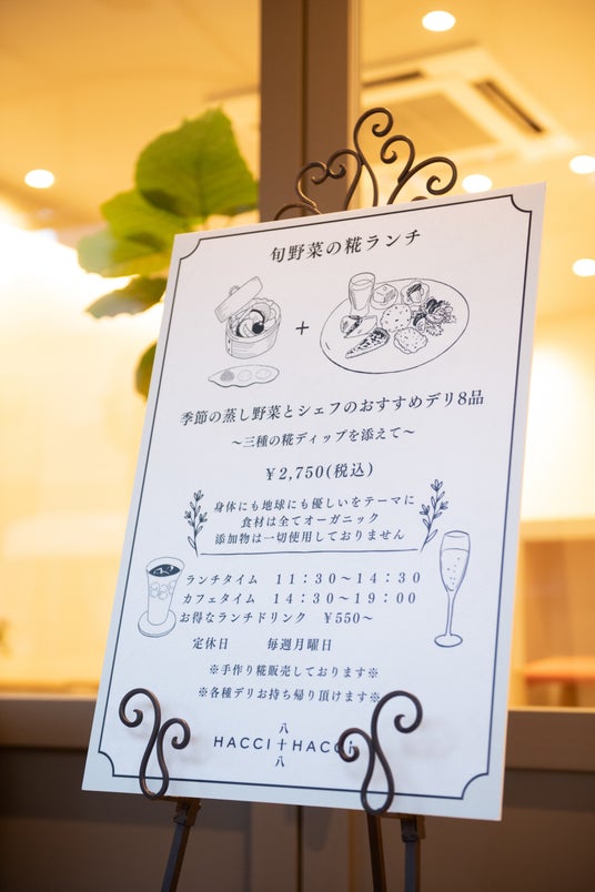 「hacci hacci芦屋本店」では、レストランの運営に加えて、生糀・加工糀・糀ディップそれぞれのカテゴリーでのオリジナル商品の販売と、各種無添加デリメニューも販売します。