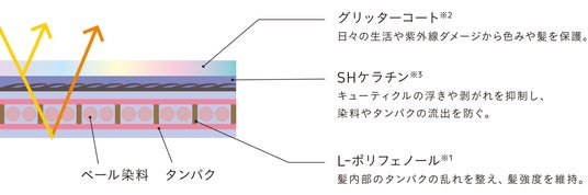 “L-ポリフェノール※1”で髪内部を補修し、キューティクルを”2層コート”することで光の乱反射を防ぎ、ハイトーンでも髪が動くたびに内側から輝くような光の色ツヤを放ちます。