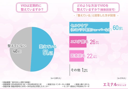 そこで、「VIOは定期的に整えていますか?」と質問したところ、『整えている(51.4%)』『整えていない(48.6%)』という回答結果になりました。