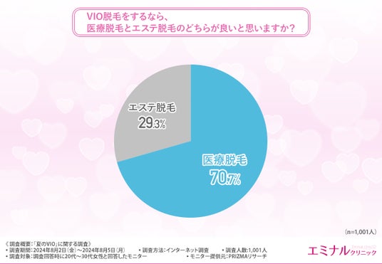 「VIO脱毛をするなら、医療脱毛とエステ脱毛のどちらが良いと思いますか?」と質問したところ、7割の方が『医療脱毛(70.7%)』と回答しました。