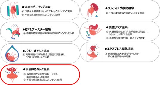 本研究では、各温泉の角層や皮脂に着目して影響を分析し(図3)、分析結果から、角層細胞への作用と皮脂を取り除く作用の組み合わせにより温泉の美肌効果を7タイプに分類しています(図4)。