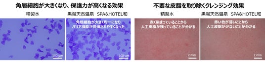 美肌温泉プロデュースタスクフォースでは、角層や皮脂への作用に注目して実際にお客様の肌にふれる浴槽に注がれる温泉水の肌への作用を評価しています。この度、「角層細胞に働きかけ肌の保護機能を高める作用」と、「不要な皮脂を取り除くクレンジング作用」の両方を併せ持つ温泉※1が新たに見つかりました(図1)。これは今までの分析で見つかっていなかった新しいタイプの作用です。