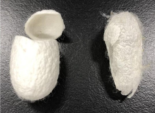 【研究の成果】 セリシンはフィブロイン繊維から分離する過程で分解され、分子量が低下する問題があります。そこで天然状態の高品質な高分子量セリシンを得るため、農研機構が保有している「セリシンホープ」という特殊なカイコ品種に着目しました。セリシンホープはフィブロインを生産せず、98%以上がセリシンで残りがその他微量成分からなる繭を作ります(図2)。