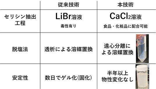 また、別の課題として、一般に高分子量セリシンの抽出に用いられるリチウム塩には毒性があり、残留の懸念から化粧品素材としての利用には安全上の問題があります。そこで、安全性が明らかで食品や化粧品への配合が既に認められているカルシウム塩を代わりに使用することで、安全な高分子量セリシンを抽出するための条件を確立しました。