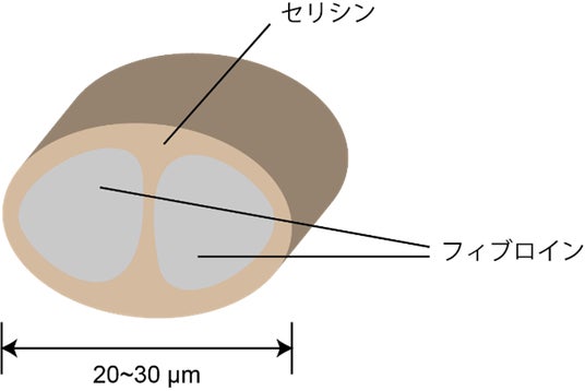 カイコの繭は繊維を構成するフィブロインと、それらを取り囲んで保護する親水性のセリシンという2種類のタンパク質からできています(図1)。