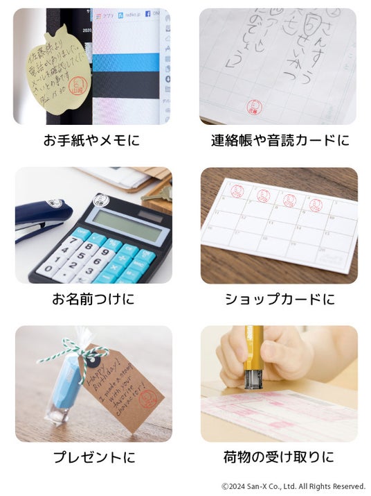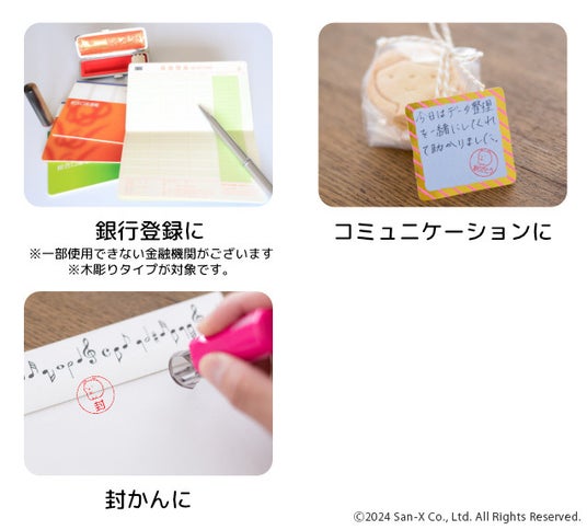 サインがわりや宅配便の受け取りなどはもちろん、お子さまの連絡帳やごほうびスタンプ、ちょっとしたお仕事などにも使えるセルフインクタイプと、全国ほとんどの金融機関で登録できる木彫りタイプの2種類。こんなにかわいいのに実用的につかえます。