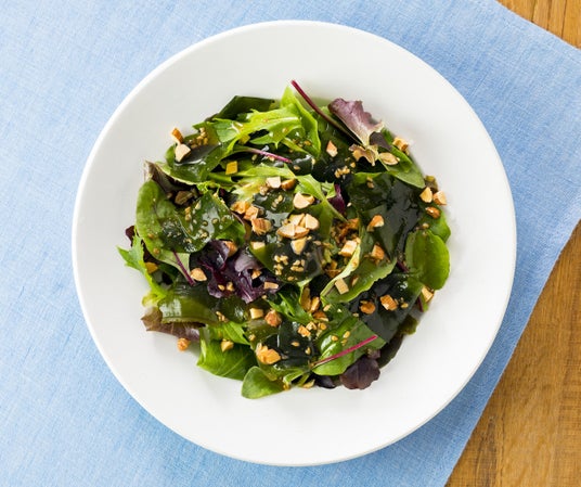 メニュー例:ベビーリーフとわかめとアーモンドのサラダ(「ごまと香味野菜」使用)