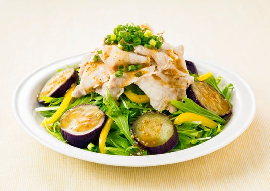 メニュー例:なすと水菜と豚しゃぶのサラダ(「ごまと香味野菜」使用)