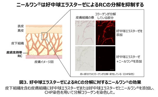 皮下組織を含むヒト皮膚組織に、白血球の一種である好中球が分泌する好中球エラスターゼという酵素を加えると、RCの主な構成成分であるコラーゲンの分解が認められました。さらに、好中球エラスターゼの作用を阻害するニールワン(R)を加えたところ、RCの分解が抑制されました(図3)。