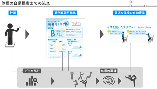 本検証では横浜国立大学、県立広島大学の研究シーズを、UNTRACKED株式会社が実用化した装置「StA²BLE(ステイブル)」を使用します。StA²BLEは、わずか1分で参加者の転倒リスクを計測し、立位年齢(R)(相応した年齢の立位能力)として可視化することができます。 計測結果に基づき、AIを使って参加者に最適な改善プログラムを提案します。