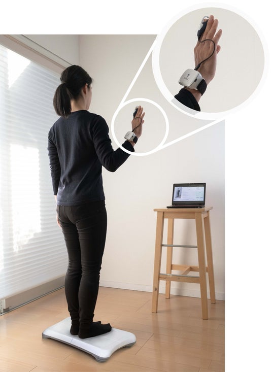 ヒトが何かに触れていると安定して立つ・歩くことができるという「ライトタッチ効果」を応用し、壁に手を添えている状態/添えていない状態を仮想的に再現。安定して立つための身体能力に加え、指先から足裏への感覚の切り替え速度などから推定できる感覚能力を評価することで、総合的に「立位年齢(R)(転倒リスク評価を加味した年齢)」を算出します。