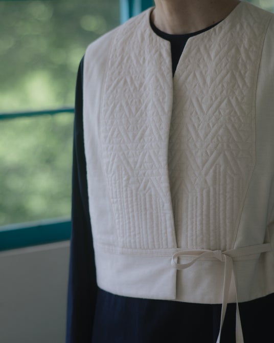 デザインは、装飾は抑えながらも、ステッチなどのディテールにひと匙のコクを加えるように、遊び心やニュアンスを添えていきます。例えば、テキスタイルより一段濃い色糸が印象に奥行きを与えるステッチは、刺し子のような工芸的な意匠や、月のような弧を描き出します。