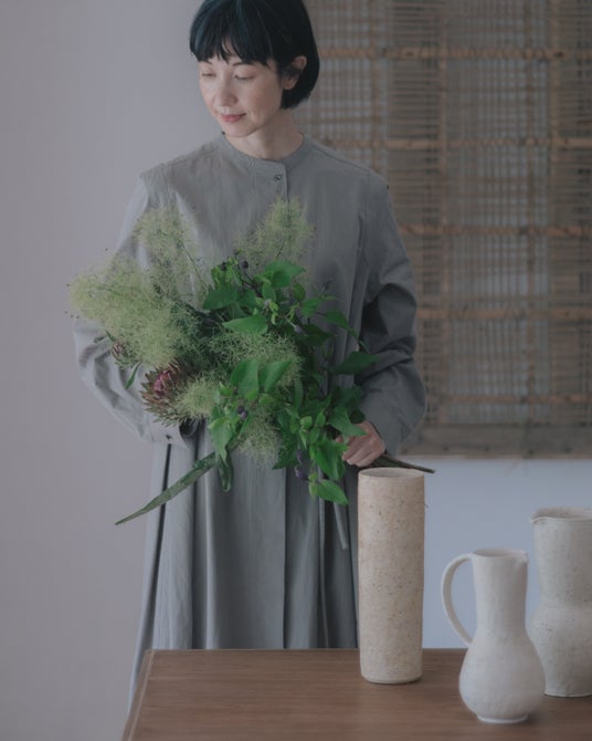 衣服は、身体を穏やかに包むシンプルなかたち。素材選びやフィット感は、肌触りや軽さなどの着心地を丁寧に設計しています。使ううち、柔らかく馴染んでいく心地よさ。細部のゆとり、全身のバランス、肌なじみ。