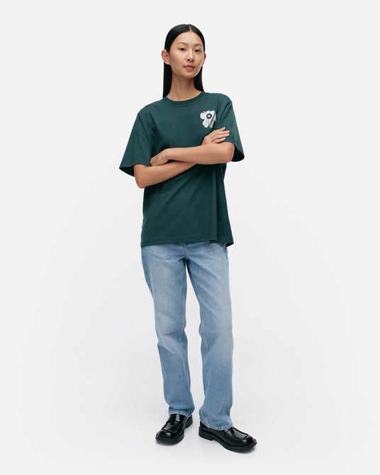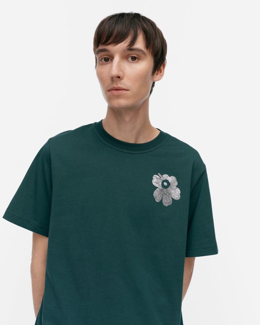 あべのハルカス限定アイテムとして、マリメッコ キオスキ(Marimekko Kioski)のTシャツが登場。キオスキの定番Tシャツのゆったりとしたシルエットをベースに、ダークグリーンのボディにメタリックシルバーのウニッコをワンポイントで施した特別なデザインとなっています。