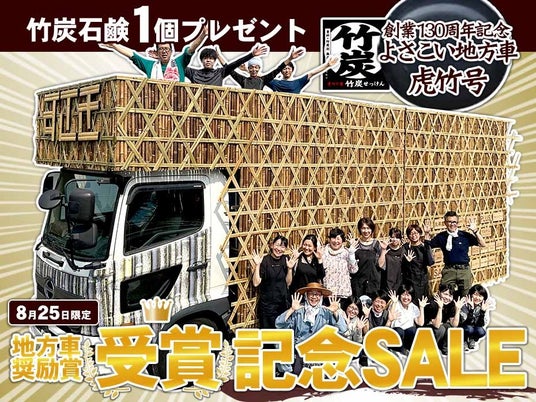 株式会社 山岸竹材店竹虎の地方車が第71回よさこい祭りで奨励賞を受賞したことを記念し、8月25日限定で税込3,300円以上の購入者に竹炭石鹸を1個プレゼント!無農薬孟宗竹を使用した自然派石鹸で、幅広い年齢層に人気です。