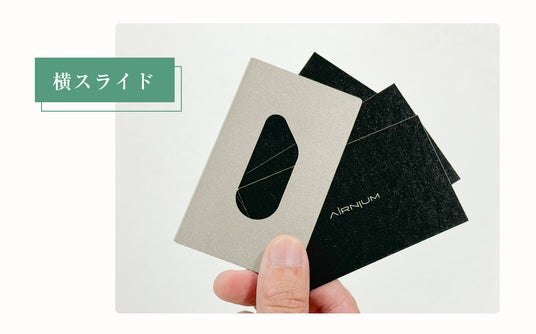 AIRNIUMの寸法は名刺とほぼ同サイズで、長財布や二つ折り、小型の財布などさまざまな財布への収納はもちろん、財布だけでなくスマホケースやパスケース、カバンのポケットなど自分のライフスタイルに合わせたところへ忍ばせることも出来ます。