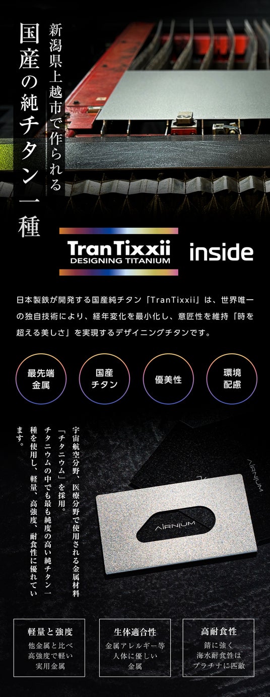 AIRNIUMには、日本製鉄株式会社が新潟県上越市で製造する国産純チタン、TranTixxii (トランティクシー)を採用しています。TranTixxiiは「時を超える美しさ」をテーマに開発されたデザイニングチタンです。素材自体に内在化された美しさに加え、世界唯一の独自技術によりチタン本来の特性を維持しつつ、経年変化の最小化を実現した長寿金属という特徴があります。