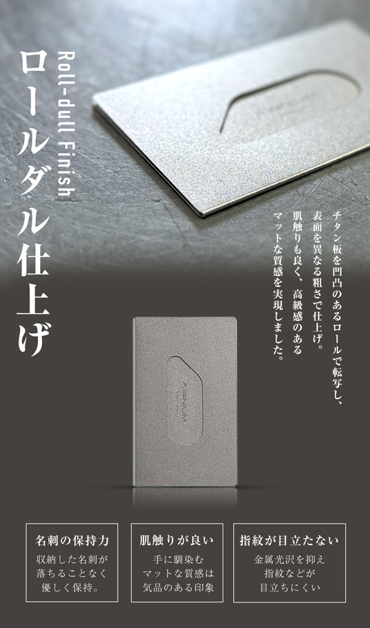 非常に軽く強靭で耐食性に優れた特徴を持つ高級金属チタンを素材へ使用することで、極薄な仕様も相まって、金属製とは思えない軽さ13gを実現。表面にはロールダル加工で梨地に仕上げることで、金属製であるにもかかわらず指紋が残りづらいマットな仕様、大人で気品ある印象をあたえます。
