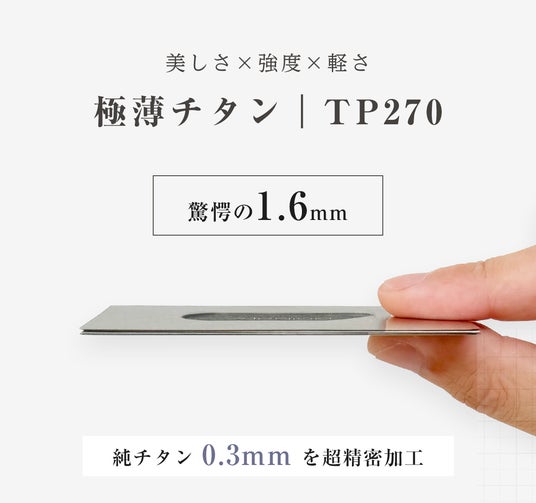 名刺入れの限界サイズに挑んだAIRNIUMの薄さは、驚愕の約1.6mmで、財布への収納を可能といたしました。素材には薄さ0.3mmに加工された国産の純チタンを使用し、一般的なサイズの名刺を最大3枚収納可能で、ヨレや汚れからしっかりと守ります。急な会食や、名刺入れを忘れてしまった緊急時に、財布に忍ばせた予備の名刺でも美しい所作での名刺交換を実現します。