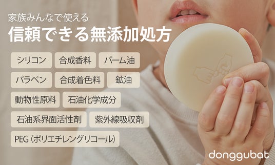 donggubatのシャンプーバーは、髪と頭皮に本当に必要な成分だけを厳選し、余計なものを一切排除した結果、固形のシャンプーとして誕生しました。合成添加物や防腐剤を使用せず、天然由来の成分で作られたこのシャンプーバーは、髪と頭皮に優しく、ご家族全員でご利用いただけます。