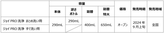 左から:「ジョイPRO洗浄 まとめ洗い用 本体」「ジョイPRO洗浄 まとめ洗い用 逆さボトル」「ジョイPRO洗浄 まとめ洗い用 詰替」「ジョイPRO洗浄 まとめ洗い用 詰替特大」「ジョイPRO洗浄 すぐ洗い用 本体」「ジョイPRO洗浄 すぐ洗い用 詰替」「ジョイPRO洗浄 すぐ洗い用 詰替特大」