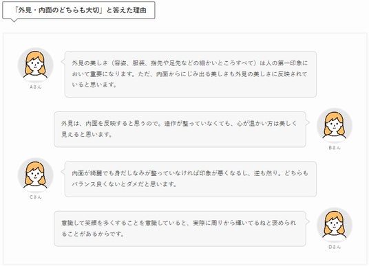 「悪口を言わない」などの回答もあり、自分だけでなく他者を認める温かみが内面からの美しさを感じる要因かもしれません。