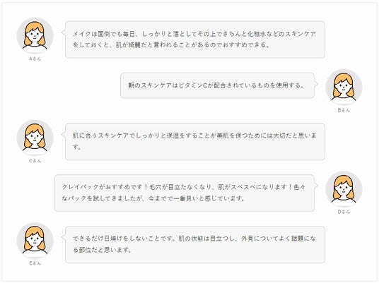 回答の中で目立ったのは、「保湿」「ビタミンC配合のスキンケア」「日焼け止めを1年中塗る」の3つ。