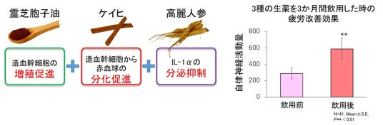 この研究結果から、根本的な疲労の改善には、新しい赤血球を増やし、機能低下した赤血球の割合を下げる必要があると考えました。そこで今回、新しい赤血球を増やす効果がある生薬の探索を行いました。その結果、古くから健康増進の生薬として珍重されている「霊芝」の胞子から抽出した油(霊芝胞子油)に造血幹細胞を増殖させる効果を発見しました。さらに、「ケイヒ」の抽出物に造血幹細胞から新しい赤血球の産生を促進する効果を、「高麗人参」の抽出物にIL-1αの分泌を抑制する効果を見出しました。