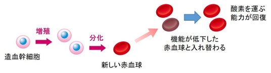 造血幹細胞は、赤血球の元となる幹細胞です。造血幹細胞は増殖(分裂)し、その一方が赤血球に変わる(分化する)ことで、新しい赤血球を生み出します。新しく生み出された赤血球が機能低下した赤血球と置き換わることで酸素を運ぶ能力が回復し、赤血球としての機能が維持されています(図2)。