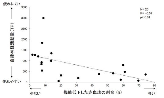 疲労の原因の1つは体内のエネルギー源であるATP(Adenosine triphosphate)の低下によって引き起こされると考えられています。このATPの産生には酸素が重要で、その酸素は赤血球によって全身の細胞へ運搬されます。赤血球はストレス、活性酸素、加齢などの影響で機能が低下し、酸素を運ぶ能力が低下します。機能が低下した赤血球が増えると、酸素の運搬が減少し、ATPの産生が低下してエネルギーが不足し、疲労しやすくなります。実際に疲労の指標である自律神経活動量と赤血球の機能の関連性を解析すると、機能低下した赤血球の割合が大きいほど疲れやすくなることが分かりました(図1)。