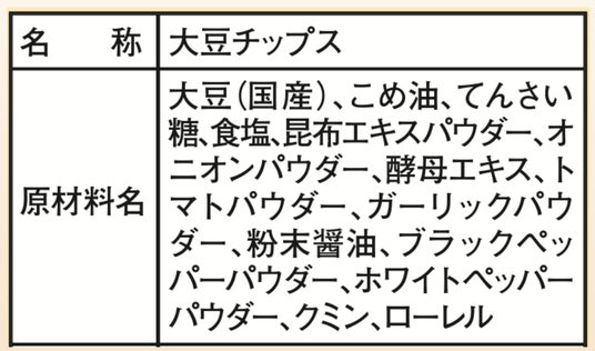 大豆(国産)、こめ油、てんさい糖、食塩、昆布エキスパウダー、オニオンパウダー、酵母エキス、トマトパウダー、ガーリックパウダー、粉末醤油、ブラックペッパーパウダー、ホワイトペッパーパウダー、クミン、ローレル