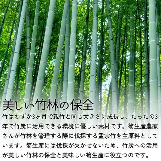 また、この竹炭枕は環境に優しい自然素材で作られており、使用後の竹炭は土に還して再利用できるエコ素材です。竹炭はわずか3ヶ月で親竹と同じ高さまで成長する孟宗竹から作られ、美しい竹林の保全や持続可能な農業にも寄与しています。