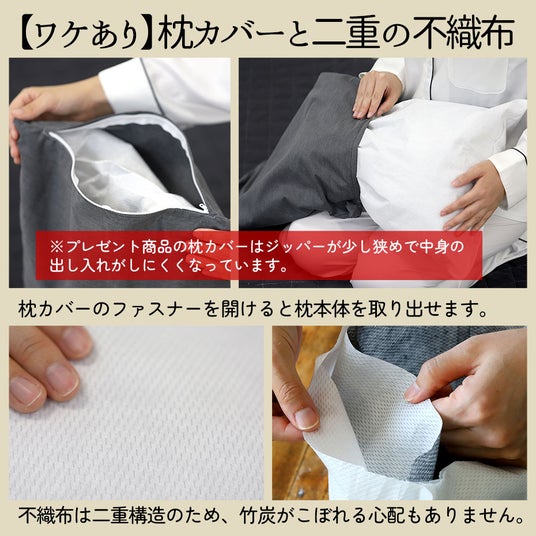 【ワケあり】という点は、枕カバーのファスナー部分が少し狭く、中身の出し入れがしづらいことです。しかし、これは使用感に影響を与えるものではなく、枕自体の品質や効果は通常の商品と同様となっております。