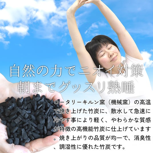 ワンジャリ快眠の消臭竹炭枕は、竹虎が誇る高品質な竹炭を贅沢に使用した枕です。竹炭はロータリーキルン窯で高温焼成されることで、軽くエアリーな質感を持ちながらも、優れた消臭性と調湿性を兼ね備えています。そのため、就寝時に気になるニオイや汗による不快感を自然の力で解消し、朝までぐっすりと快適な眠りをサポートします。