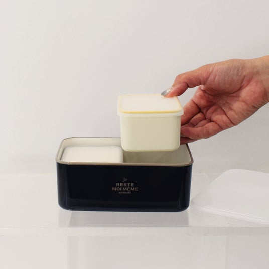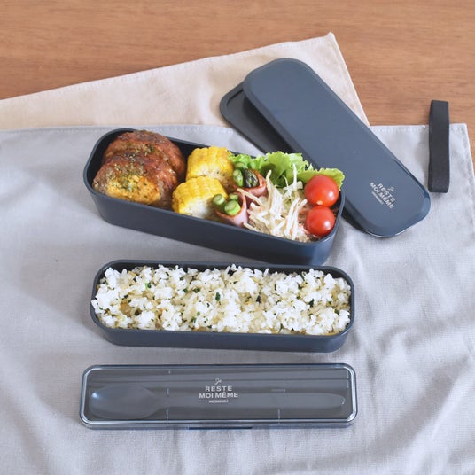 シンプル形状、たっぷり容量の2段ランチボックス。スリムな形状でかばんの中で邪魔になりにくい。食べ終わったあとはコンパクト収納ができてさらにすっきり。内側は黒色の樹脂を使用していて高級感アップ。汚れが気にならないのも嬉しいポイントです。