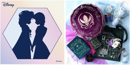 「アナ」と「エルサ」をイメージしたペアマグです。雪の結晶のシャープさを、マグの形状や取手のデザインに落とし込みました。マグの柄はそれぞれの衣装の柄を取り入れたデザインです。