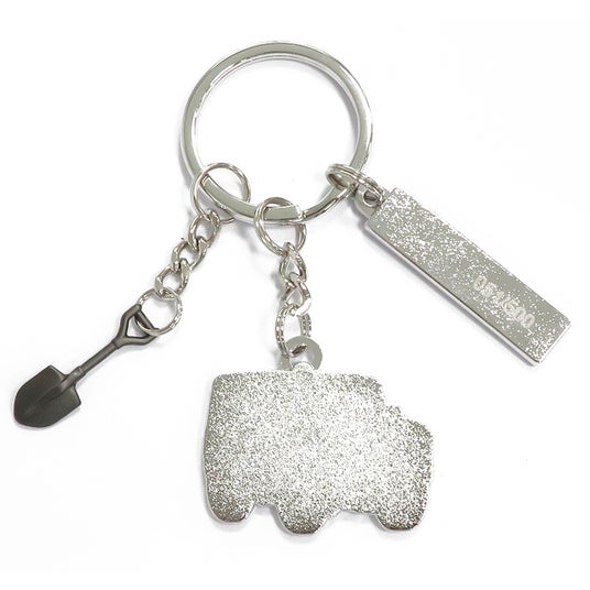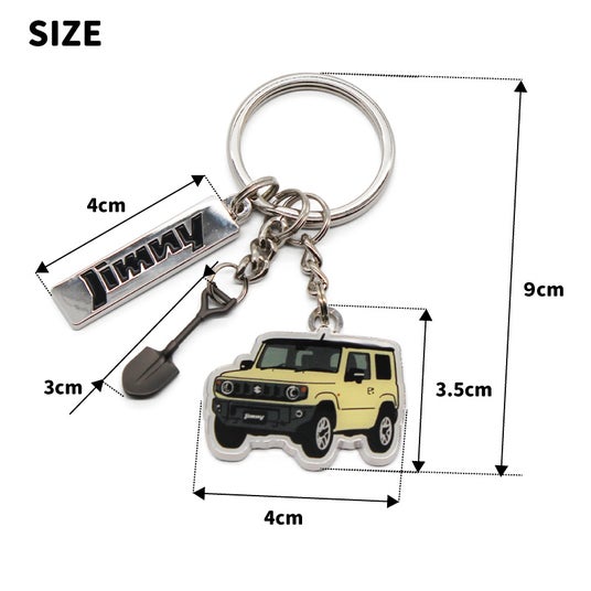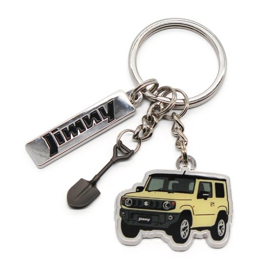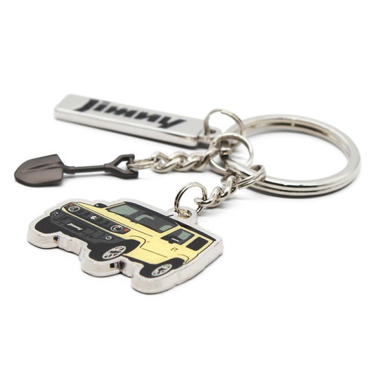 大人気車種であるJIMNYのイラストが施されたメタルプレート、JIMNYのロゴマークプレート、マットブラックの小さなスコップチャームが並ぶ遊び心溢れるキーチェーンは、生産数が500個限定となっており、プレート裏面には1/500のシリアルナンバーが刻印されています。
