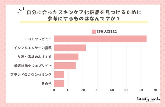 株式会社Sheer株式会社Sheer(https://b-sheer.co.jp/ )が運営するベストコスメを中心とした美容レビューメディア「美容マニア」(https://b-sheer.co.jp/biyo-mania/ )は、20歳以上の美容に興味のある132人に「自分に合ったスキンケア化粧品を見つけるために参考にするものは?」についてのアンケート調査を実施。