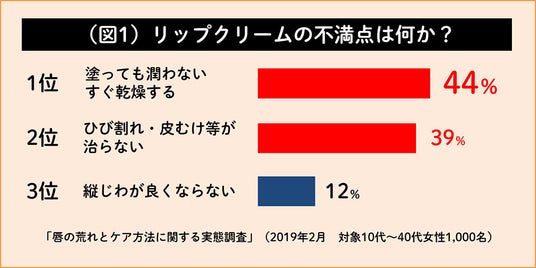 当社のリップ製品は1988年に「ユースキン リップケア」として販売を開始しました。2019年には、ブランド名を「ユースキン リリップ」に変更しブランドの強化を図ってまいりました。当社が実施した調査によると、リップ製品を使用しているにもかかわらず、「塗ってもすぐに乾燥する」「ひび割れや皮むけが治らない」といった不満を抱えている方が多くいらっしゃいます(図1)。そのため、唇荒れを効果的にケアするためには、症状に合ったリップ製品を選ぶことが重要となります。