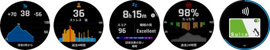 左から、Body Battery、ストレススコア、睡眠スコア、血中酸素トラッキング、Suica