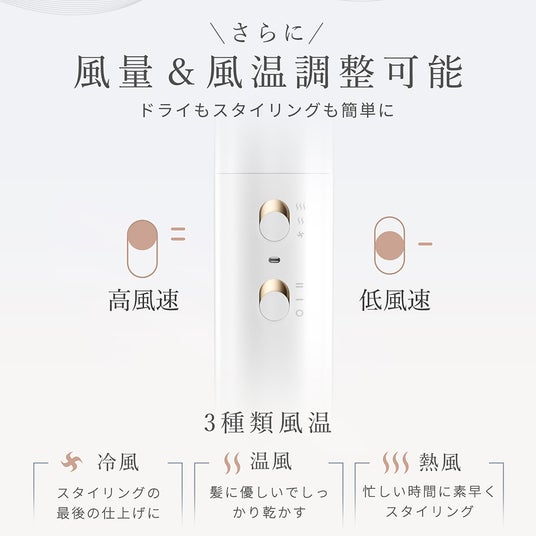 2段階の風量と3種類の風温を組み合わせることで、6通りの使い方が可能。髪質やスタイリングに合わせて、最適なモードを選ぶことができます。