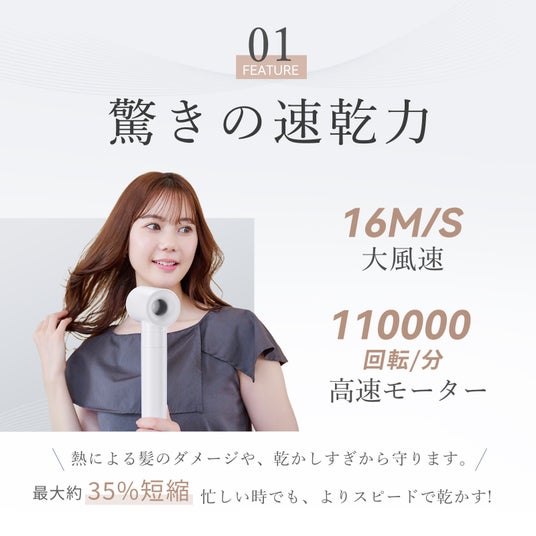 16M/Sの大風速と110000回転/分の高速モーターを搭載。これにより、髪の水分を素早く飛ばし、乾かす時間を大幅に短縮。熱によるダメージを最小限に抑え、髪への負担を軽減します。